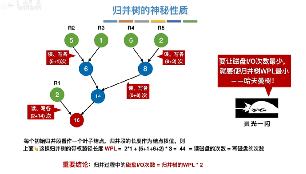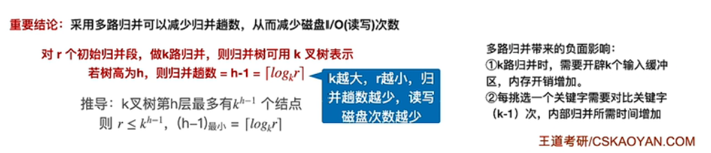 - 总读写磁盘次数 = 文件总块数 *2* (归并趟数 + 1)(构造初始归并段+归并的趟数)