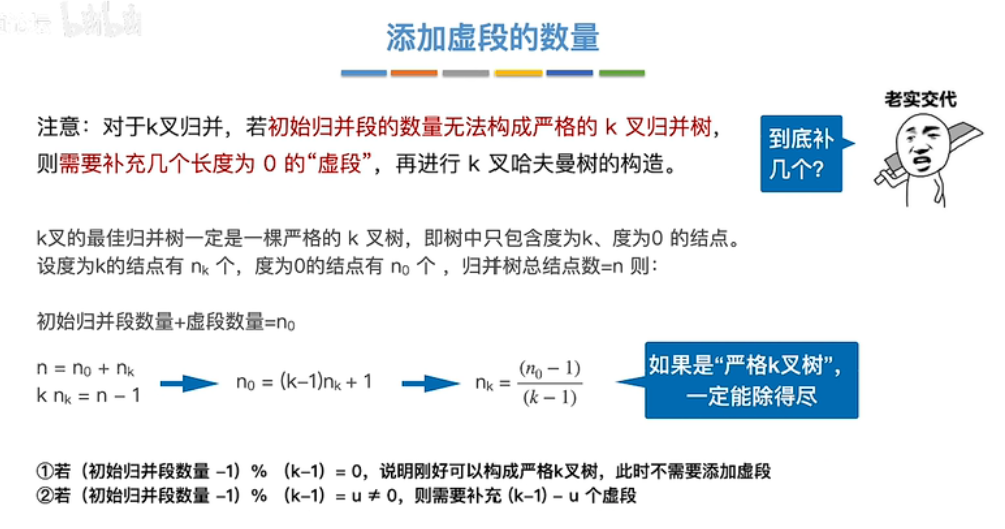 二路归并和多路归并原理相同,都是构造哈夫曼树;对于 k 叉归并,如果初始归并段数量无法严格构成 k 叉归并树,需要补充长度为 0 的 "虚段"