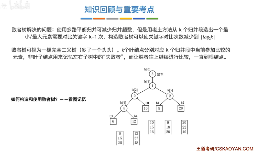 k 路归并 k 过大时会导致选出一个最小元素需要对比 k-1 次,败者树可以优化这个;败者树的结点存放失败者,最后多一个额外的结点存储冠军